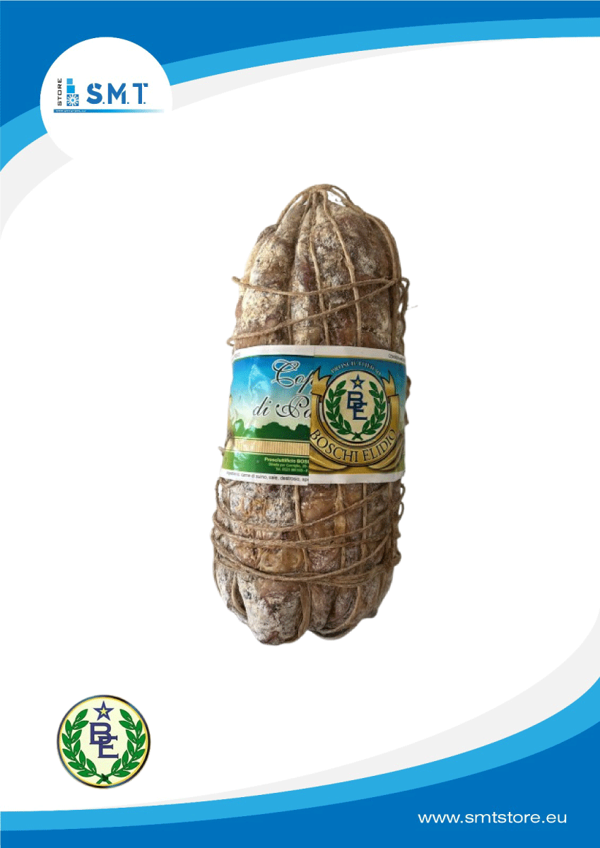La Coppa Boschi Elidio è ottenuta da carni di suino nazionale cui sono aggiunti spezie e sale, quindi insaccate e legate artigianalmente. Nelle nostre cantine sono lasciate a maturare ed acquisire aroma e profumo per un tempo non inferiore a 90 giorni. La nostra Coppa ha forma tipica, caratteristica, leggermente ovale; la superficie è segnata dalla legatura manuale in spago di canapa naturale.
